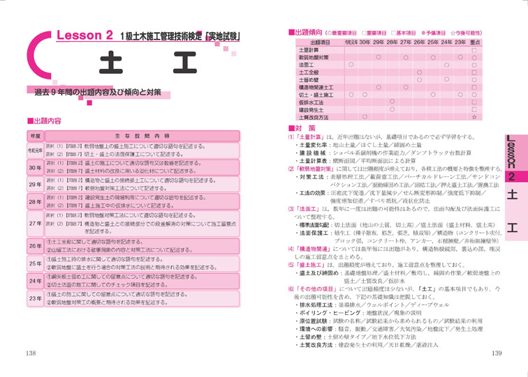 信頼と実績を誇る「1級土木施工管理技術検定 第2次検定(実地試験)」合格テキストの決定版! 「1級土木施工管理技士」となるには「1級土木施工管理技術検定試験」の「第1次検定(学科試験)」に合格した後、経験重視の「第2次検定(実地試験)」に合格しなければなりません。 本書は「経験記述文書の例文50集」を掲載し、多くの土木工事、工種、管理項目に対応できるようにしました。 また、「学科記述試験」においては、最新9年間の「出題傾向」を分析。 内容を分野別(土工、コンクリート、品質管理、安全管理、施工計画、環境保全対策)に構成し、レッスン冒頭の「チェックポイント」は豊富なイラストや図表を取り入れ、丁寧にわかりやすく解説しました。 また、平成28年から令和6年度の9年間の過去問を掲載し、選択肢の一つひとつに詳細な解説をつけました。 巻末には令和5年度の「第2次検定」の問題・解説・解答試案を掲載。 この1冊で「第2次検定」の合格へと導きます。